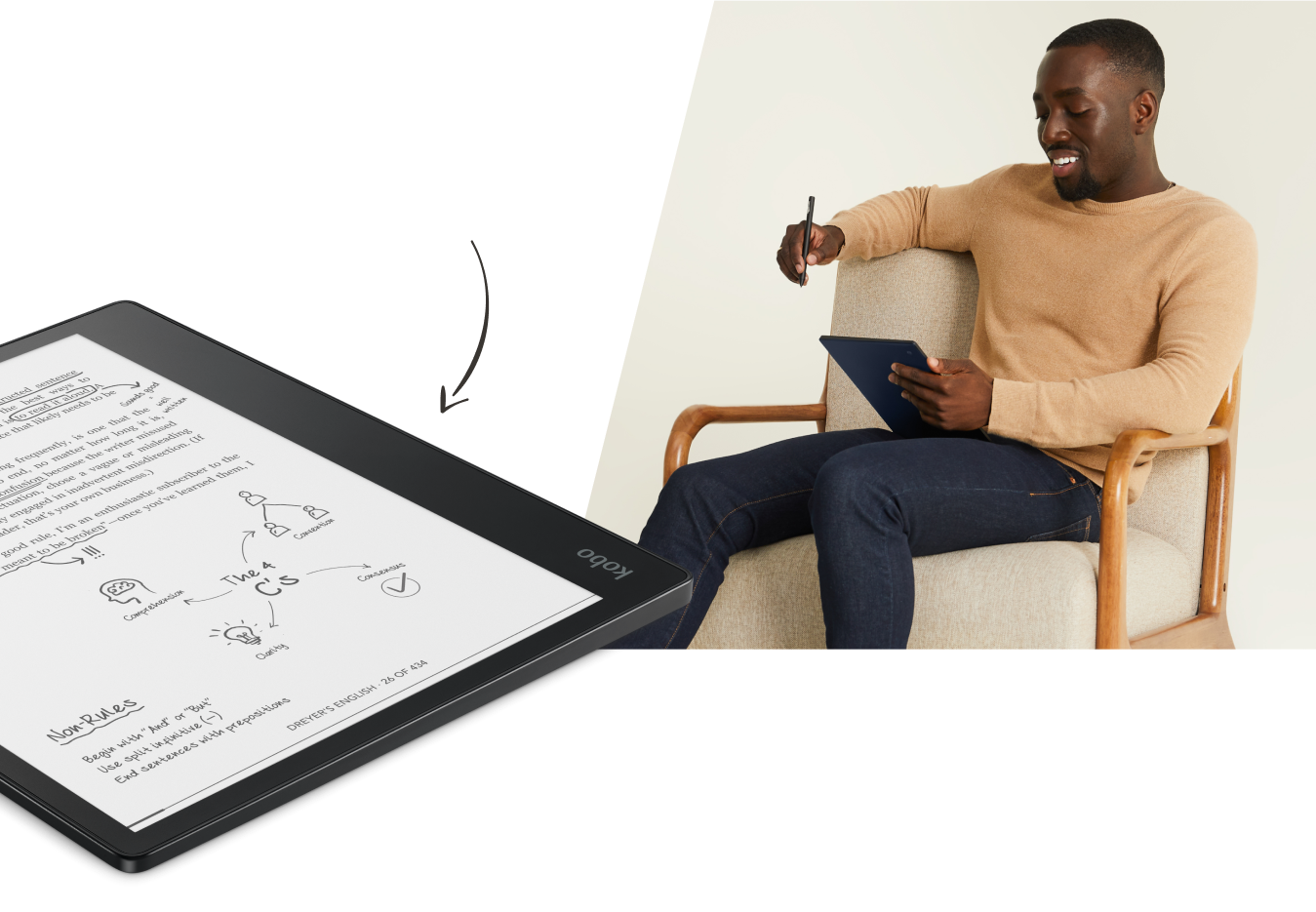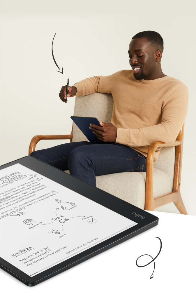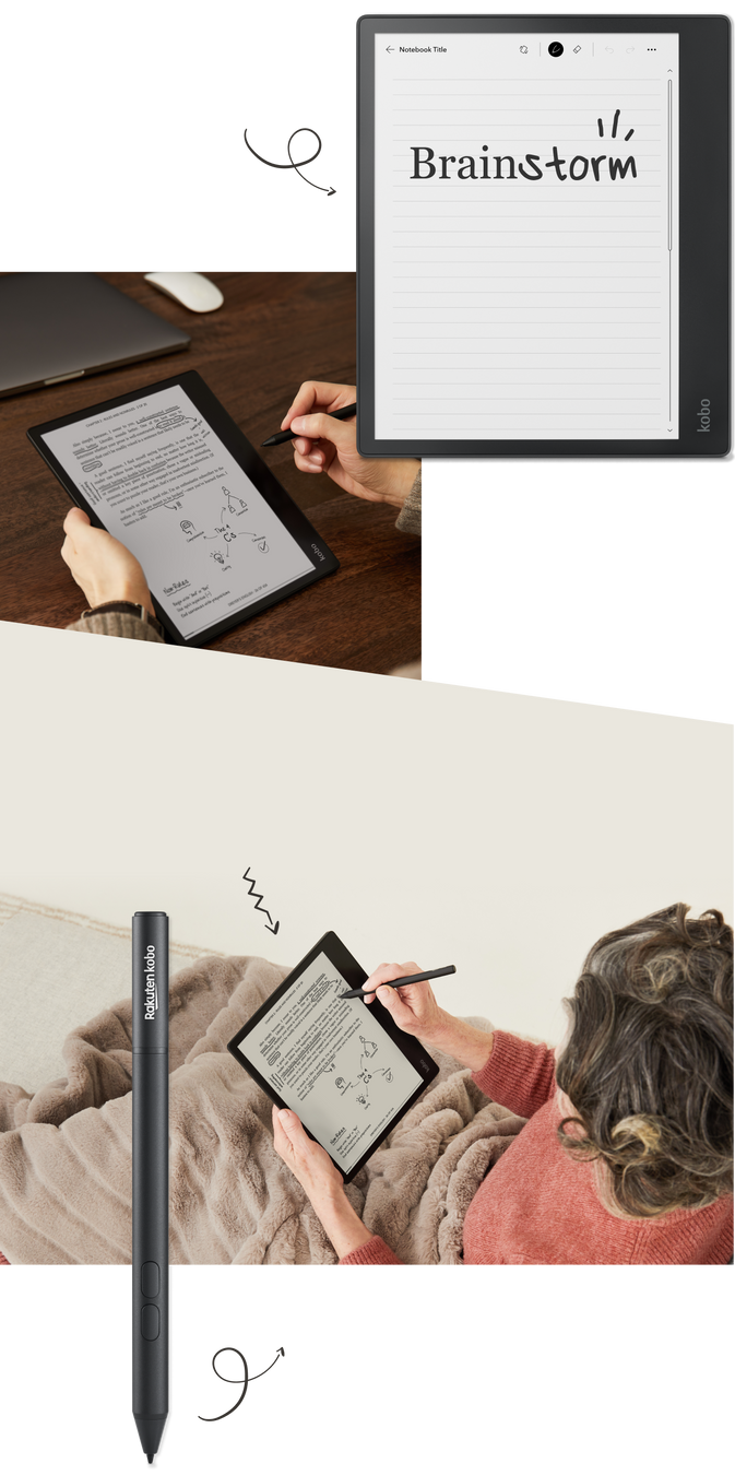 Put conventional paper aside and think bigger with an intuitive note-taking experience and an expansive 10.3” touchscreen. Use the Kobo Stylus to make notes in eBooks and PDFs*. Plus, you can create your own notebooks, where you can instantly convert your notes to clean typed text, and export them off your device as needed. With 32GB of storage, you'll be able to carry more than your book bag can handle. When you want to listen to a story, enjoy Kobo Audiobooks with Bluetooth® wireless technology†. And when you're ready for a break, simply close the SleepCover to protect Kobo Elipsa and put it to sleep. Kobo Elipsa is your book, notebook, and bookstore combined, bundled with everything you need to make your ideas a reality.